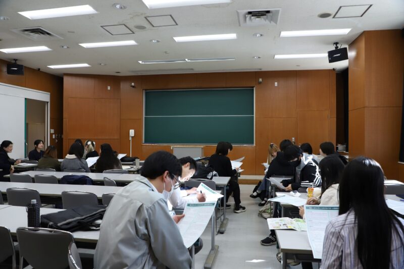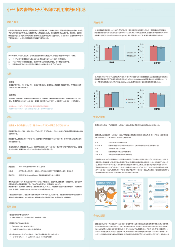 フィールドリサーチ演習1(学部1年)の授業では、小平市役所の職員の皆さまからいただいた「小平市の課題」に関して、学生がチームに分かれて、当該授業で学んだ量的な方法を用いて実証的な実験・調査を行い、その結果に基づいて提案を行っている。